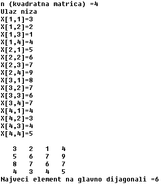 WRITELN('Najveci element na glavno dijagonali =', max);