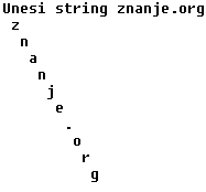 Učitati niz znakova /STRING/. Ispisati znak ispod znaka upisanog stringa u dijagonalu. Prema uzorku na slici: