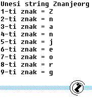 15.2. Učitati niz znakova /STRING/ . Ispisati znak ispod znaka upisanog stringa. Opis programa: String se ispisuje znak po znak korištenjem naredbe LENGTH (broj znakova u stringu) i time što je s[i] definisan kao niz znakova. Ispis znak po znak se izvodi sa s[i] , a ispis u novi red naredbom Writeln Listing programa: PROGRAM P15111012; USES WinCRT; VAR i : Integer; s : String; BEGIN Write('Unesi string '); Readln(s); FOR i := 1 TO LENGTH(s) DO Writeln(i, '-ti znak = ', s[i]); END. Ispis na ekranu: ![]()