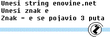 Opis programa: String i znak se ispisuje sa tastature. FOR petlja omogućuje da se svi znakovi s[i] uporede sa učitanim znakom. Upoređivanje se izvodi naredbom IF c = z[i] THEN . Za svaki pronađeni isti znak uvačava se brojač br.