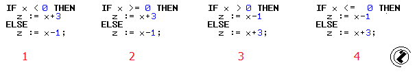 Ako je x > 0 tada je z := x-1 inače je z := x+3;