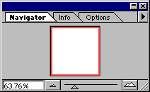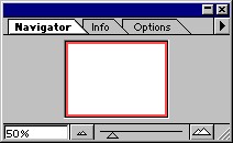 Navigator Kartica "Navigator" je prva u prozoru "Navigator", i kao sto i samo ime govori, obavlja funkciju prikazivanja gotovog rada u malom.Na dijelu prozora koji je za to predvidjen, vidi se slika koju trenutno obradjujemo, i rub kvadrata crvene boje. Taj rub predstavlja velicinu prozora koji mi stvarno vidimo i u kome obradjujemo sliku, a bijela povrsina u pozadini predstavlja velicinu slike. Ispod srednjeg dijela, nalazi se linija sa parametrima, odnosno horizontalni "scroll bar" koji odredjuje vrijednost "zoom" opcije. Vrijednost uvecanja mozete promjeniti na tri nacina: unesete vrijednost u postotcima u prozor lijevo, rucno povlacite pokazivac po liniji, ili da kliknete na jednu od dvije slike sa obe strane "scroll bar"-a.