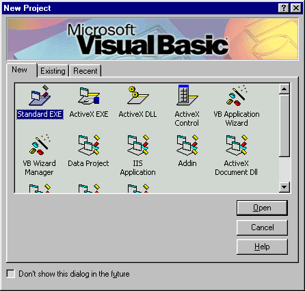 3. Standard EXE projekat Kada nestane najavni ekran, pojaviće se zahtjev da napravite nov projekat. Visual Basic projekat sastoji se od svih datoteka koje su potrebne za izradu određene vrste aplikacije. Zasad odaberite Standard EXE iz prozora New Project da biste mogli da vidite preostali dio radne okoline Visual Basica. Pritisnite OK. |