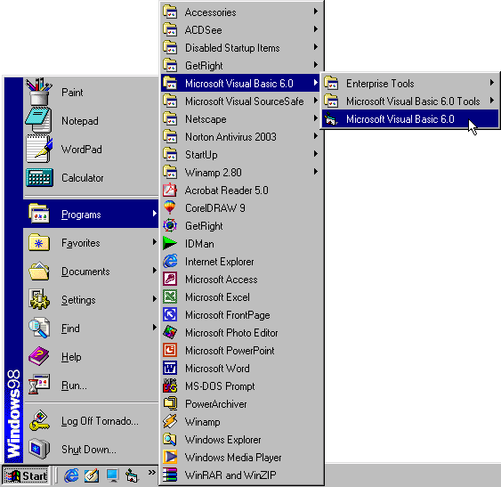 1. Pokretanje Visual Basica To možete učiniti na više načina, a najlakši od njih je biranjem prečice (eng. shortcut) iz Start Menuja Start > Programs > Microsoft Visual Basic 6.0. Možete sebi napraviti prečicu na desktopu. |