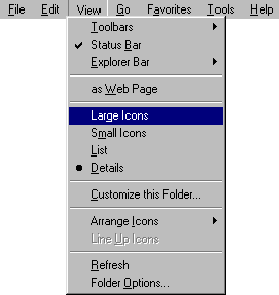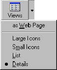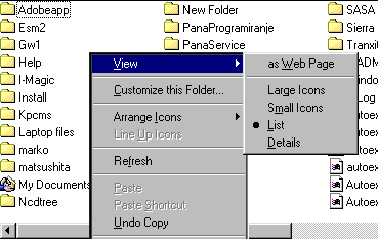 Large icons – Ikone foldera i fajlova su velike Small icons – Ikone foldera i fajlova su male List – Ikone foldera i fajlova su poput liste Details – Ikone foldera i fajlova pojavljuju se sa detaljima: ime, veličina fajla, tip i datum kada je kreiran ili otvoren posljednji put. as Web Page – Desna strana foldera izgleda kao Web stranica. Prikazuje sadržaj dokumenta. |