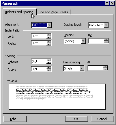 ![]() Opcija koja se koristi za definisanje nekoliko parametara u tekstu: - Alignment: tekst se može centrirati prema levo, desno, centru i postoji još opcija za prilagođavanje preko cele strane (justified). - Outline level: omogućava podešvanje spoljne linije paragrafa na ponuđene nivoe. - Indention ili tzv. dubina redova se može podešavati na desno i levo. - Spacing: opcija koja se koristi za podešavanje razmaka među redovima. Tu postoje različite mogućosti (jednoredan, jednoiporedan razmak, dupli itd.). Opcije Align Left, Center, Align Right, Justify, Icrease and Decrease Indent se takođe mogu pronaći i odrediti na tzv. Toolbar-u. Opcija PREVIEW omogućava da se tekst probno vidi. TAB opcija omogućava centriranje teksta, manuelno i automatski. |