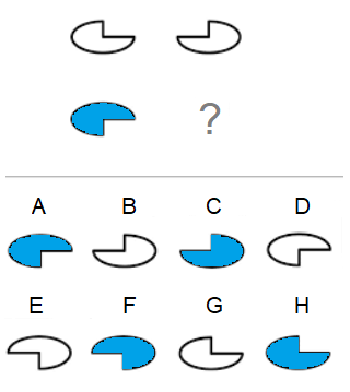 Pravilo 2. Prvi red su bijeli a drugi red plavi likovi. Zaključak: Nedostaje plavi lik bez isječka u donjem lijevom uglu. Tačan odgovor: |
