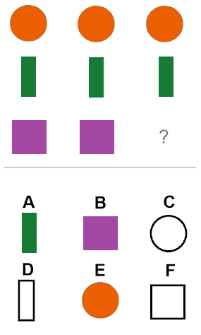 Zadatak: Prepoznavanje lika koji nedostaje: Rješenje Pravilo 1: Svaki red sadrži svoj lik: krug, pravougaonik i kvadrat. Pravilo 2: Svaki red ima svoju boju: narandžasta, zelena i ljubičasta. Zaključak: Nedostaje ljubičasti kvadrat. Tačan odgovor: |