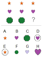 Zadatak: Prepoznavanje oblika koji nedostaje: Rješenje Pravilo 1: Svaki red sadrži svoj lik: zvijezda, srce i osmougaonik. Pravilo 2: Svaki red ima svoju boju: narandžasta, ljubičasta i zelena. Zaključak: Nedostaje zeleni osmougaonik. Tačan odgovor: |