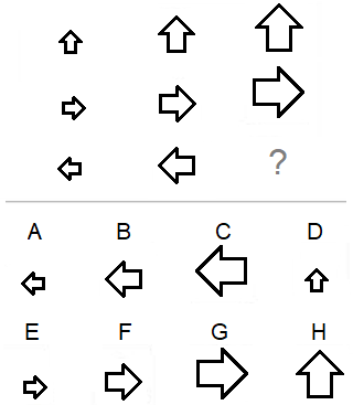 Zadatak: Prepoznavanje lika koji nedostaje: Rješenje Pravilo 1: Svaki red sadrži svoj lik: strelica na gore, strelica u desno i strelica u lijevo, Zaključak: Nedostaje strelica u lijevo. Tačan odgovor: |