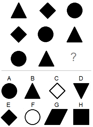 Zadatak: Prepoznavanje lika koji nedostaje: Rješenje Pravilo 1: Svaki red ima sva 3 lika: trougao, dijamant i krug.