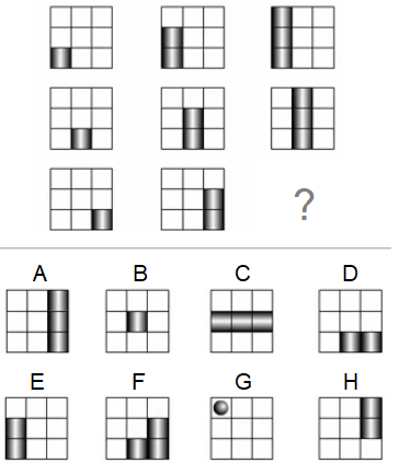 Zadatak: Prepoznavanje lika koji nedostaje: Rješenje Pravilo 1: Kvadrati u prvom redu su lijevo poravnati, u drugom redu je centralno poravnanja a u trećem redu je desno poravnanje. Pravilo 2: Broj kvadrata je jedan u prvoj koloni, dva u drugoj koloni, tri u trećoj koloni. Zaključak: Tražena lik je 3 kvadrata desno poravnata. Tačan odgovor: |