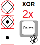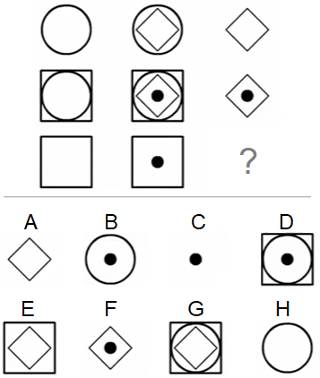 II verzija rješenja. Svaka element se ponavlja samo 2 puta u svakom redu. Zaključak: 3. red se ponavlja kvadrat a jednom je tačka. Rješenje samo crna tačka. Tačan odgovor: |