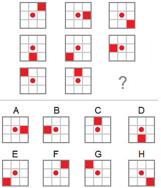 Pravilo 2. Redoslijed kretanja je po rednim brojevima likova (vidi sliku). Pravilo 3. Krug u centru se nepomjera. Zaključak. Nedostaje lik sa kvadratom u gornjem desnom uglu i krugom u centru. Tačan odgovor: |