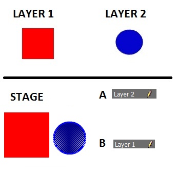 Flash. LAYER 1 sadrži crveni kvadrat, LAYER 2 sadrži plavi krug. STAGE je kao na slici. Koji sloj je aktivan:
