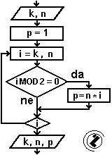 Izračunati proizvod parnih prirodnih brojeva od k do n.