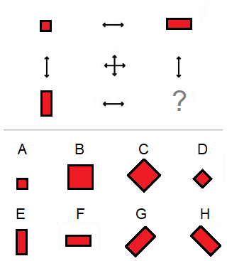 Zadatak: Prepoznavanje lika koji nedostaje: Rješenje Pravilo 1: Smjerovi strelica ukazuju na smjer promjene veličine (istezanje, smanjenje). Zaključak: Treći red horizontalna strelica ukazuje na promjenu horizontalne dimenzije pravougaoonika u veliki kvadrat. Tačan odgovor: |
