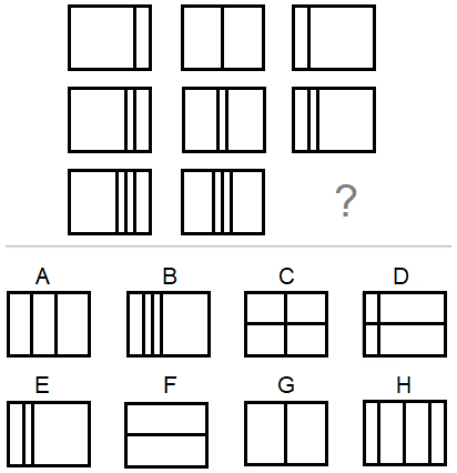 Zadatak: Prepoznavanje lika koji nedostaje: Rješenje Pravilo 1: Prva kolona sadrži jednu liniju, druga dvije linije i treća tri linije. Pravilo 2: Svaka kolona ima horizontalno poravnanje: desno, centralno i lijevo. Linije prve kolone su desno poravnate, linije druge kolone su centrirane, a treće kolone su lijevo poravnate Zaključak: Traženi lik je tri linije lijevo poravnate. Tačan odgovor: |