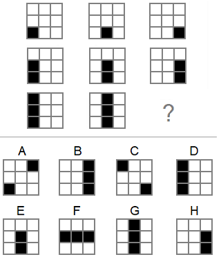 Zadatak: Prepoznavanje oblika koji nedostaje: Rješenje Pravilo 1: Prvi red sadrži jedan kvadrat, drugi dva kvadrata i treći red tri kvadrata. Pravilo 2: Poravnanje kvadrata u prvoj koloni je lijevo, u drugoj koloni je centralno, a u trećoj koloni je desno poravnanje. Zaključak: Tražena lik je treći red to je 3 kvadrata, treća kolona desno poravnata. Tačan odgovor: |