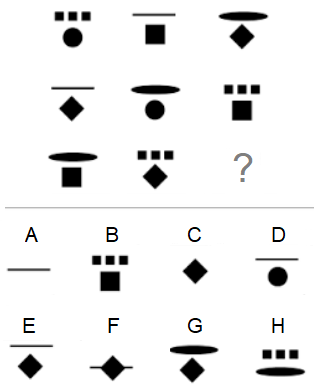 Zadatak: Prepoznavanje lika koji nedostaje: Rješenje Pravilo 1. Svaki red u gornjem dijelu ima tri lika: linija, elipsa i 3 kvadrata. Pravilo 2. Svaki red u donjem dijelu ima tri lika: krug, kvadrat i dijamant. Zaključak. Nedostaje u gornjme dijelu linija a u donjem krug. Tačan odgovor: |