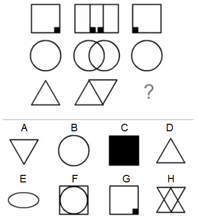 Zadatak: Prepoznavanje lika koji nedostaje: Rješenje Pravilo 1. Od dva lika u redu formira se treći (A ∪ B = C). Lik iz prve ćelije zajedno sa likom iz treće ćelije tvori lik iz druge ćelije. Tačan odgovor: |