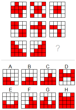 Zadatak: Prepoznavanje lika koji nedostaje: Rješenje Pravilo 1. Od dva lika u redu formira se treći (A ∪ B = C). Zaključak: Tražni lik se sastoji od kvadratića koje se pojavljuju u prva dva lika. Tačan odgovor: |