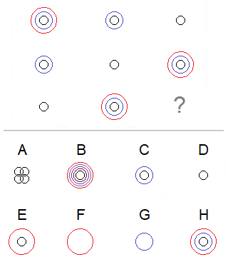 Zadatak: Prepoznavanje lika koji nedostaje: Rješenje Pravilo 1: Svaki red sadrži likove sa jedan, dva ili tri koncentrična kruga. Zaključak. Nedostaje lik sa dva kruga. Tačan odgovor: |