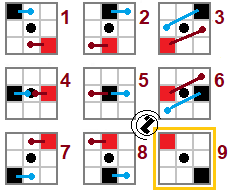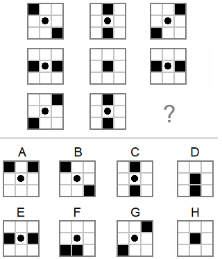 Pravilo 2. Na kraju reda prelaze u slijedeći red: Pravilo 3. Krug u centru se nepomjera. Preko kruga se postavljaju kvadrati. Zaključak. Nedostaje lik sa kvadratima u gronjem lijevom i donjem desnom uglu. Tačan odgovor: |
