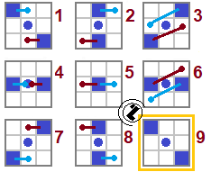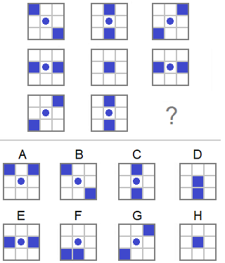 Pravilo 2. Na kraju reda prelaze u slijedeći red: Pravilo 3. Krug u centru se nepomjera. Preko kruga se postavljaju kvadrati. Zaključak. Nedostaje lik sa kvadratima u gronjem lijevom i donjem desnom uglu. Tačan odgovor: |